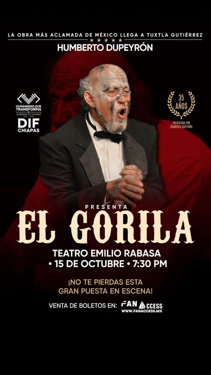 Tuxtla Gutiérrez recibirá una de las puestas en escena más aclamadas del teatro mexicano. Se trata de El Gorila, una adaptación teatral de la obra de Franz Kafka, dirigida y protagonizada por el reconocido actor Humberto Dupeyrón.