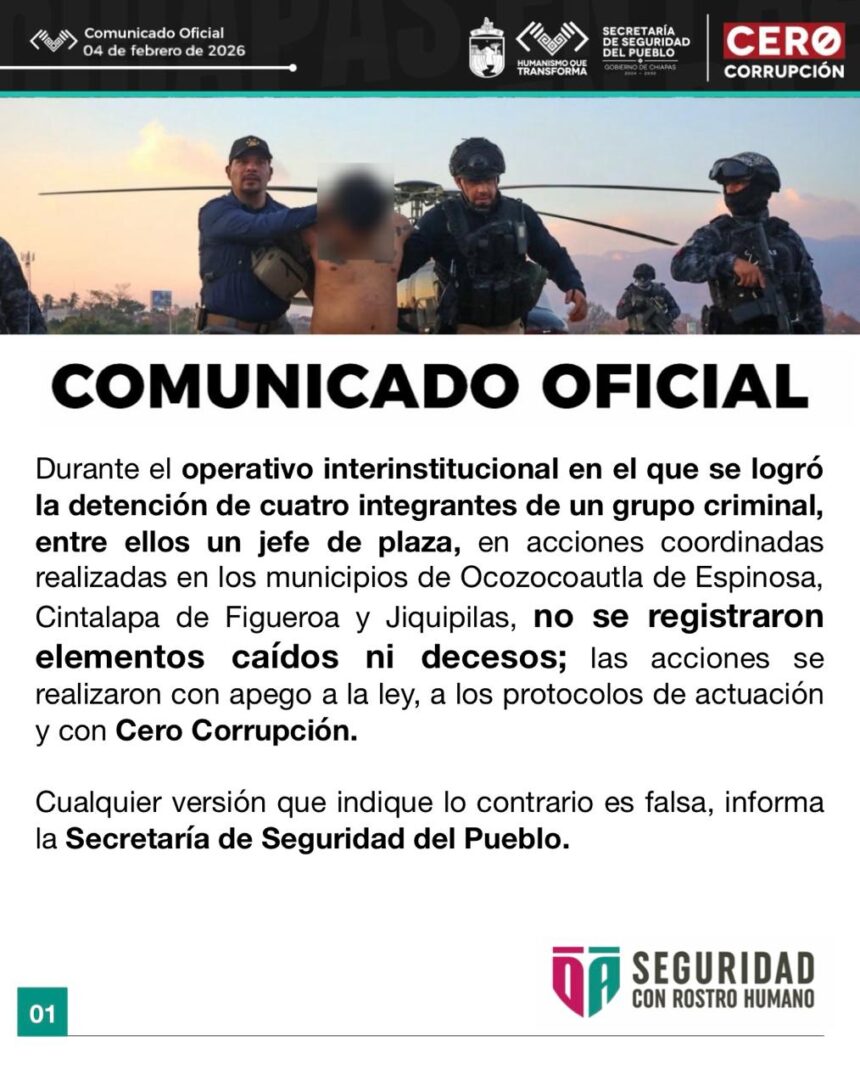 Cae «Jefe de Plaza» en la Región Valles de Chiapas tras fuerte operativo interinstitucional Las autoridades estatales confirman la detención de cuatro generadores de violencia sin registrar bajas ni enfrentamientos letales, desmintiendo rumores de supuestos decesos. Tuxtla Gutiérrez Jueves 05 de febrero de 2026 Un golpe estratégico a la estructura del crimen organizado se registró este miércoles en la zona centro de la entidad. La Secretaría de Seguridad del Pueblo informó que, mediante un operativo coordinado entre fuerzas estatales y federales, se logró la captura de cuatro presuntos integrantes de una célula delictiva, identificando a uno de ellos como un «Jefe de Plaza» que operaba en los municipios de Ocozocoautla de Espinosa, Cintalapa de Figueroa y Jiquipilas. Operativo Limpio Las acciones se llevaron a cabo el pasado 04 de febrero de 2026, desplegando elementos por tierra y aire —con apoyo de helicópteros de la Secretaría— en puntos estratégicos del llamado «Corredor de los Valles». De acuerdo con el Comunicado Oficial emitido por el Gobierno de Chiapas (administración 2024-2030), las detenciones se realizaron «con estricto apego a la ley y a los protocolos de actuación». Uno de los puntos más destacados por la autoridad es el saldo blanco de la intervención. Contrario a diversas versiones que circularon en redes sociales durante la tarde del miércoles, la dependencia subrayó: > «No se registraron elementos caídos ni decesos; las acciones se realizaron con apego a los protocolos de actuación y con Cero Corrupción.» > Objetivo Prioritario Aunque el comunicado oficial no revela el nombre completo del líder detenido por razones del debido proceso, fuentes de seguridad consultadas apuntan a que se trata de un objetivo prioritario encargado de la logística criminal en la conexión entre la Depresión Central de Chiapas y la zona limítrofe con Oaxaca y Veracruz. La región de Ocozocoautla-Cintalapa ha sido históricamente un punto neurálgico para el trasiego de mercancías ilícitas, convirtiéndose en años recientes en un escenario de disputas territoriales entre grupos antagónicos. La captura de este «Jefe de Plaza» representaría una desarticulación significativa en la cadena de mando local. Reacción Oficial La Secretaría de Seguridad del Pueblo, bajo el lema «Seguridad con Rostro Humano», hizo un llamado a la ciudadanía a no caer en la desinformación. «Cualquier versión que indique lo contrario [sobre supuestos muertos] es falsa», sentenció la institución, buscando calmar la incertidumbre que suele acompañar a estos despliegues de alto impacto. Los cuatro detenidos fueron puestos a disposición de las autoridades ministeriales correspondientes, quienes definirán su situación jurídica en las próximas horas. Se espera que la seguridad en los tramos carreteros de la zona se mantenga reforzada para prevenir posibles reacciones delictivas. Contexto: ¿Por qué es clave esta zona? Los municipios de Ocozocoautla, Jiquipilas y Cintalapa conforman un corredor estratégico (conocido como la Región Valles) que conecta el centro de Chiapas con la costa y el estado vecino de Oaxaca. En los últimos años, esta ruta ha sido disputada por su valor para el control de rutas de tráfico, lo que ha motivado una presencia constante y reforzada de la Guardia Nacional y el Ejército en la zona.