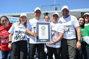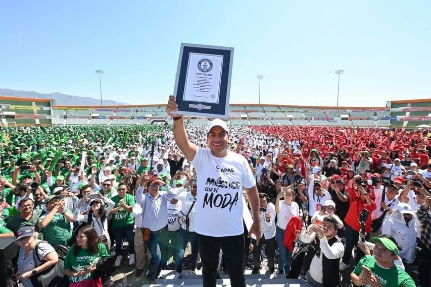 *Chiapas rompe Récord Guinness de la Imagen Humana de Camiseta de Fútbol Más Grande* Chiapas rompió el Récord Guinness de la Imagen Humana de Camiseta de Fútbol Más Grande, con la participación de 4 mil 757 personas. El gobernador Eduardo Ramírez Aguilar se sumó a este este primer evento oficial rumbo a la Copa Mundial de la FIFA 2026 que se llevó a cabo en el Estadio Víctor Manuel Reyna, en Tuxtla Gutiérrez, mismo que fue presenciado de manera virtual por la presidenta de la República, Claudia Sheinbaum Pardo, quien felicitó a todas y todos los participantes. Durante un enlace en la Conferencia de Prensa Matutina “Mañanera del Pueblo”, el mandatario, acompañado por la señora Sofía Espinoza Abarca, agradeció a la presidenta la oportunidad de proyectar a Chiapas a nivel nacional e internacional, e invitó a turistas de México y del extranjero a conocer y disfrutar de la riqueza natural y cultural del estado.