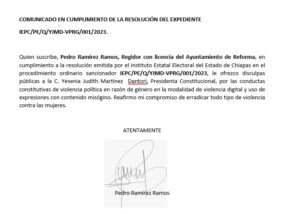 Quien suscribe, Pedro Ramírez Ramos, Regidor con licencia del Ayuntamiento de Reforma, en cumplimiento a la resolución emitida por el Instituto Estatal Electoral del Estado de Chiapas en el procedimiento ordinario sancionador IEPC/PE/Q/YJMD-VPRG/001/2023, le ofrezco disculpas públicas a la C. Yesenia Judith Martínez Dantori, Presidenta Constitucional, por las conductas constitutivas de violencia política en razón de género en la modalidad de violencia digital y uso de expresiones con contenido misógino. Reafirmo mi compromiso de erradicar todo tipo de violencia contra las mujeres.