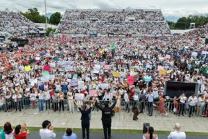 Con la presidenta Claudia Sheinbaum, Chiapas avanza La presidenta Claudia Sheinbaum reunió a más de 40 mil personas en el Estadio Olímpico de Tapachula, donde destacó que México es fuerte porque no hay división entre gobierno y pueblo. Anunció una inversión de más de 45 mil millones de pesos en programas de bienestar para Chiapas, obras de infraestructura, apoyos al campo y mejoras en educación y salud. El gobernador Eduardo Ramírez subrayó que el respaldo presidencial ha sido clave para brindar paz, seguridad y confianza al estado, y agradeció el apoyo en la reconstrucción de los puentes dañados en Mapastepec.