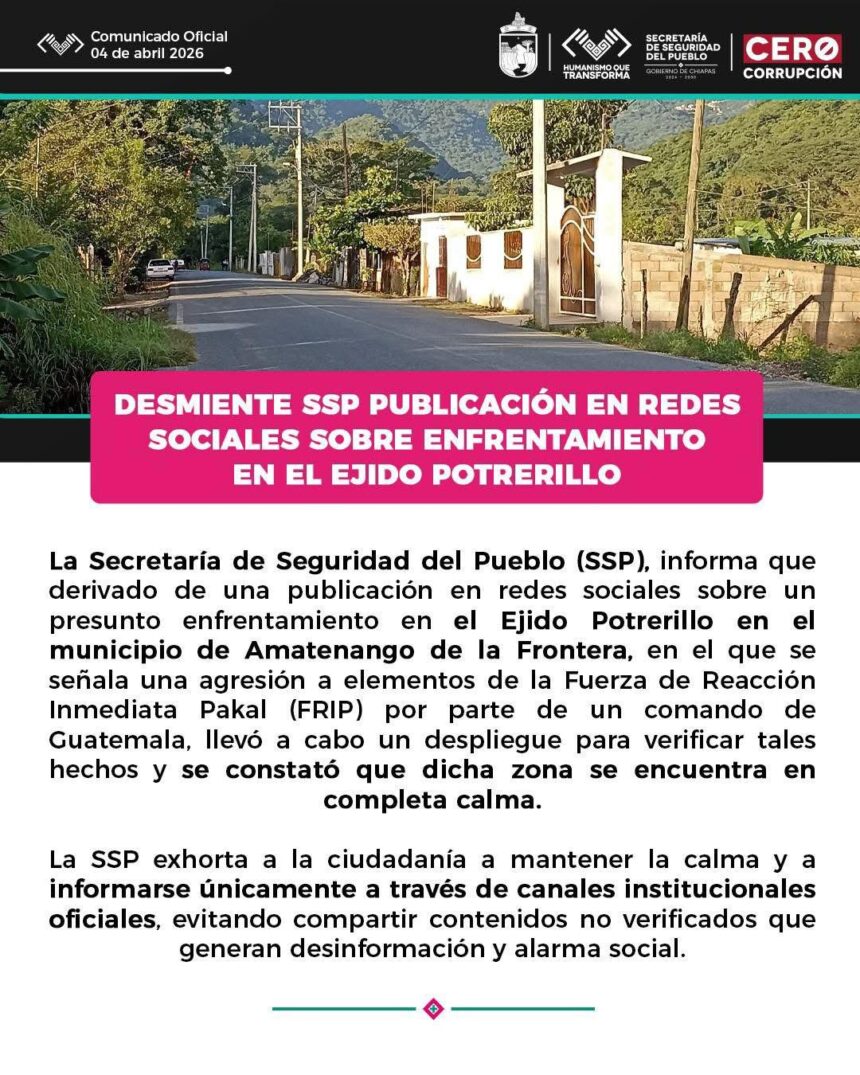 *Desmiente SSP publicación en redes sociales sobre enfrentamiento en el Ejido Potrerillo* La Secretaría de Seguridad del Pueblo (SSP) informa que derivado de una publicación en redes sociales sobre un presunto enfrentamiento en el Ejido Potrerillo en el municipio de Amatenango de la Frontera, en el que se señala una agresión a elementos de la Fuerza de Reacción Inmediata Pakal (FRIP) por parte de un comando de Guatemala, llevó a cabo un despliegue para verificar tales hechos y se constató que dicha zona se encuentra en completa calma. La SSP exhorta a la ciudadanía a mantener la calma y a informarse únicamente a través de canales institucionales oficiales, evitando compartir contenidos no verificados que generan desinformación y alarma social.