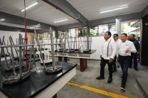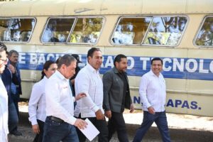 Más tarde, el gobernador recorrió las instalaciones del Centro de Bachillerato Tecnológico Industrial y de Servicios (CBTis) número 108, institución que recientemente cumplió 50 años de vida. En ese marco, se comprometió a respaldar a este plantel con la construcción de sanitarios, así como la rehabilitación de talleres, salones y laboratorios, a fin de dotar a las y los estudiantes de espacios dignos que favorezcan su aprendizaje.