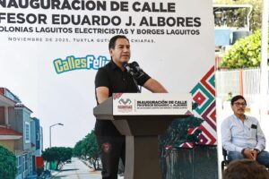 *Eduardo Ramírez y Angel Torres inauguran modernización de calle de las colonias Laguitos Electricistas y Borges Laguitos* – La obra atiende una demanda añeja de las y los habitantes de esta zona de Tuxtla Gutiérrez En Tuxtla Gutiérrez, el gobernador Eduardo Ramírez Aguilar y el presidente municipal, Angel Torres Culebro, realizaron la inauguración de la rehabilitación integral y modernización de la calle Profesor Eduardo J. Albores, una obra que beneficiará a habitantes de las colonias Laguitos Electricistas y Borges Laguitos. En este marco, Ramírez Aguilar señaló que la entrega de esta vialidad responde a una demanda añeja de las y los vecinos de la zona. Añadió que su gobierno continuará trabajando de manera coordinada con el Ayuntamiento para impulsar más acciones en favor de la capital chiapaneca. Por su parte, el alcalde Angel Torres explicó que la pavimentación de esta calle, olvidada por más de 30 años, mejora de forma significativa la movilidad de diversas colonias. Detalló que el proyecto incluyó la rehabilitación del sistema pluvial y sanitario, así como la instalación de luminarias, guarniciones y jardineras. A nombre de la población, Raúl García Ramos, habitante de la colonia Laguitos Electricistas, agradeció al gobernador por la gestoría que permitió concretar la pavimentación de una vialidad que durante años resultó intransitable y que hoy ofrece un tránsito más seguro para peatones y automovilistas. En el acto estuvieron presentes el secretario del Humanismo, Francisco Chacón Sánchez, y habitantes de las colonias beneficiadas.