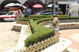 De acuerdo con las instrucciones giradas por el presidente municipal, Andrés Carballo Córdova, personal trabaja en la explanada del parque central, en mantenimiento en las jardineras en donde se aplica el recubrimiento con pintura nueva.
